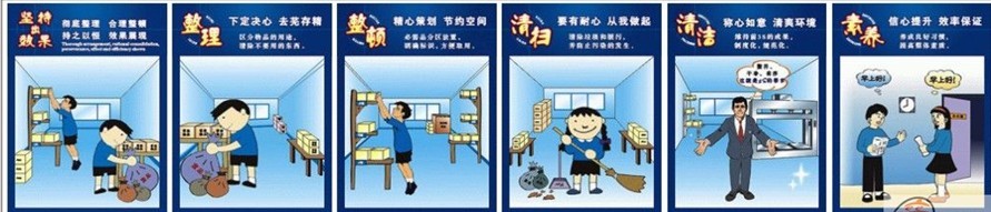 “整理”的意思是区分必需品和非必需品,倒掉垃圾,把长期不用的东西放回仓库;“整顿”的目的,是把寻找必需品的时间减少到最低,让常用物品随手可得;“清扫”,意思是确保岗位上无垃圾、无灰尘、干净整洁;“清洁”,是将整理、整顿、清扫进行到底,并制度化;“修养”,是严守作业标准,保持作业环境良好,员工心情愉快。